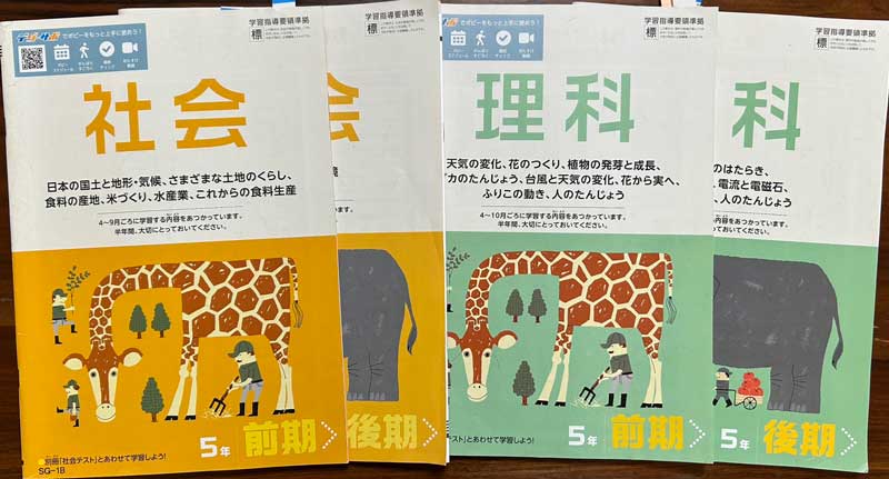 上の写真は、理科・社会のワーク。前期と後期に分かれています。